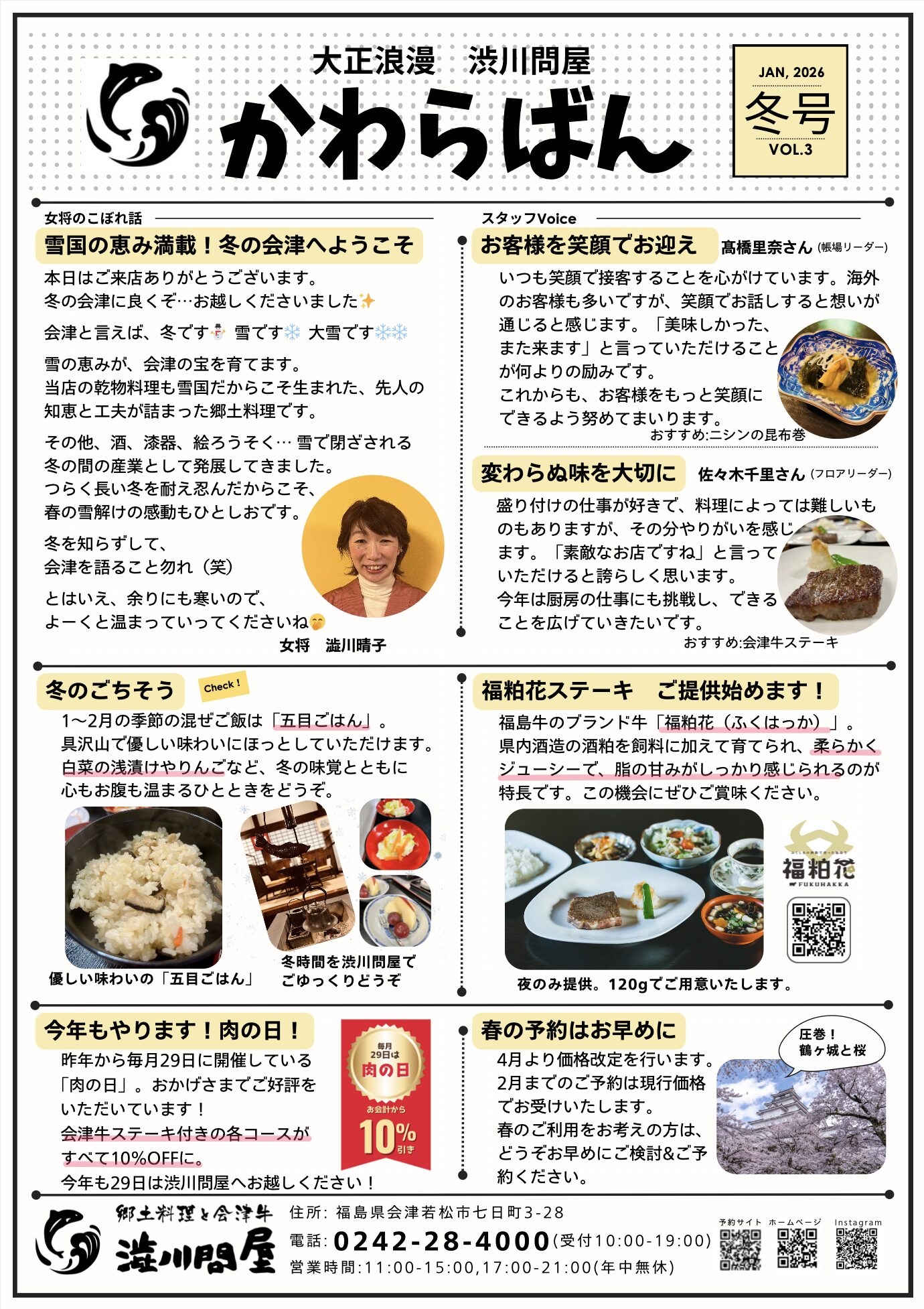 \「かわらばん・冬号」発行のお知らせ/ 2026.2.4 お知らせ いつも渋川問屋をご利用いただき、誠にありがとうございます。 「かわらばん・冬号」を発行いたしました。店頭に設置しておりますので、ご来店の際はぜひご覧くださいませ。 暦の上では春となりましたが、もう少し寒い日が続きそうです。体と心がホッとする「こづゆ」や数量限定の「福粕花ステーキ」など、 体が温まる料理をご用意してお待ちしております。 春のご予約も承っております。お気軽にご相談ください。 ※「かわらばん・冬号」PDFのダウンロードはこちらから 前の記事 一覧へ戻る