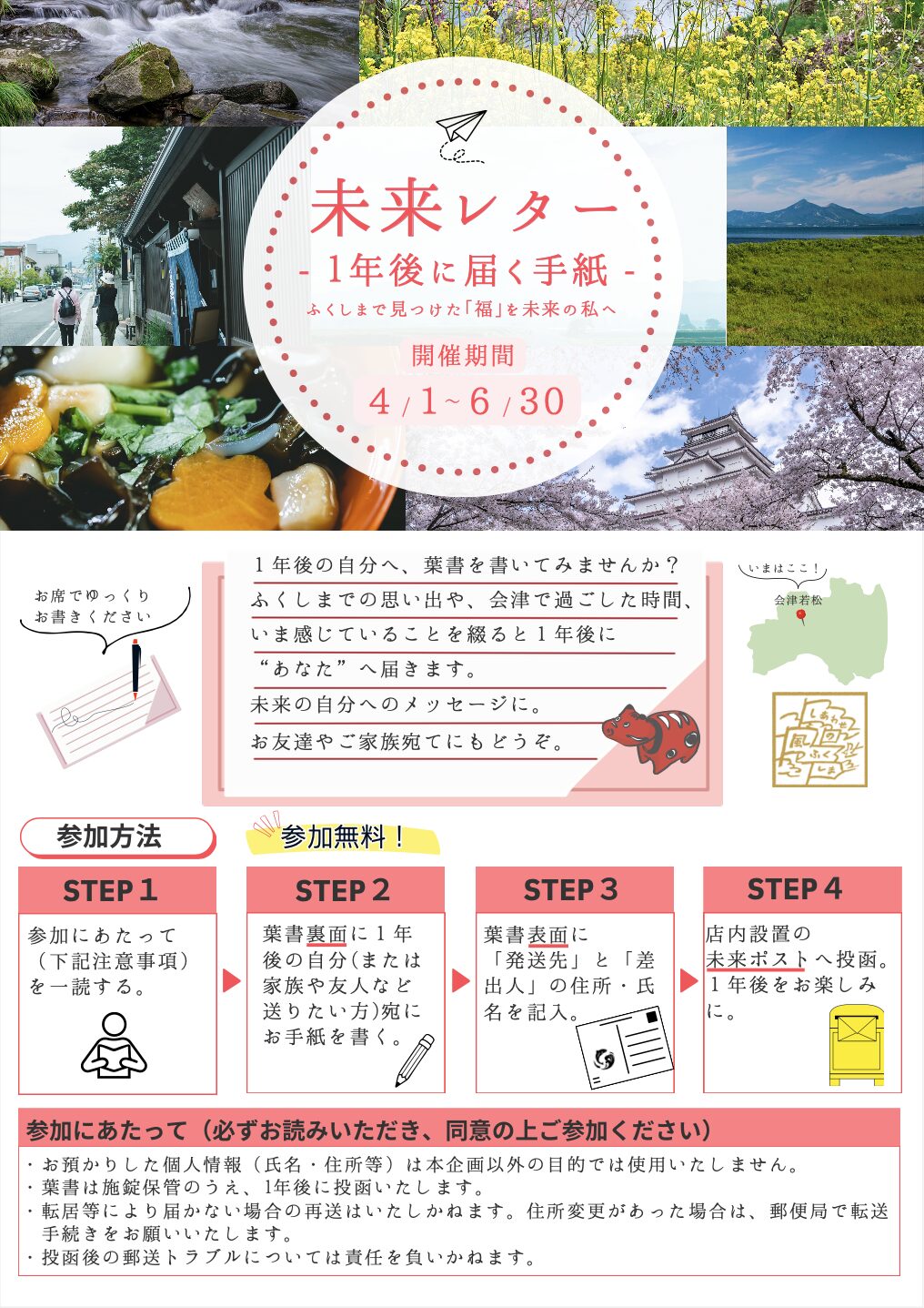 【6/30まで開催!】未来レター 〜1 年後に届く手紙〜 2026.4.8 お知らせ 旅の思い出を、1年後の自分へ届けてみませんか? この場所で感じたことを、あえて手書きで残す特別なひととき。1年後、旅の記憶とともに届きます。 もちろん、地元の方の参加も大歓迎です! 当店でお食事や喫茶をご利用いただいた方はどなたでもご参加いただけます。 ご家族やお友達宛のお便りにも。どうぞお気軽にご参加ください。 ※参加無料/専用葉書は店内にご用意しております※6月30日まで開催!(ふくしまデスティネーションキャンペーン企画) 前の記事 一覧へ戻る